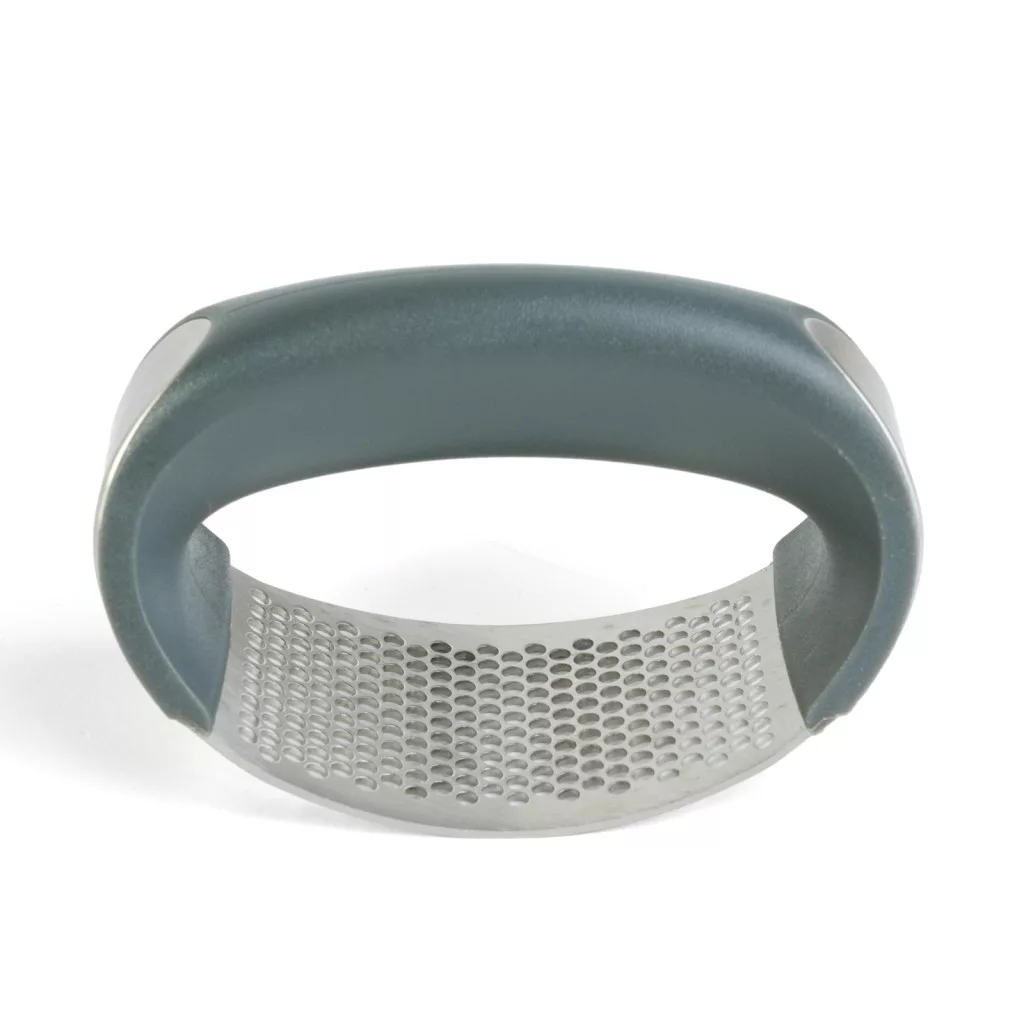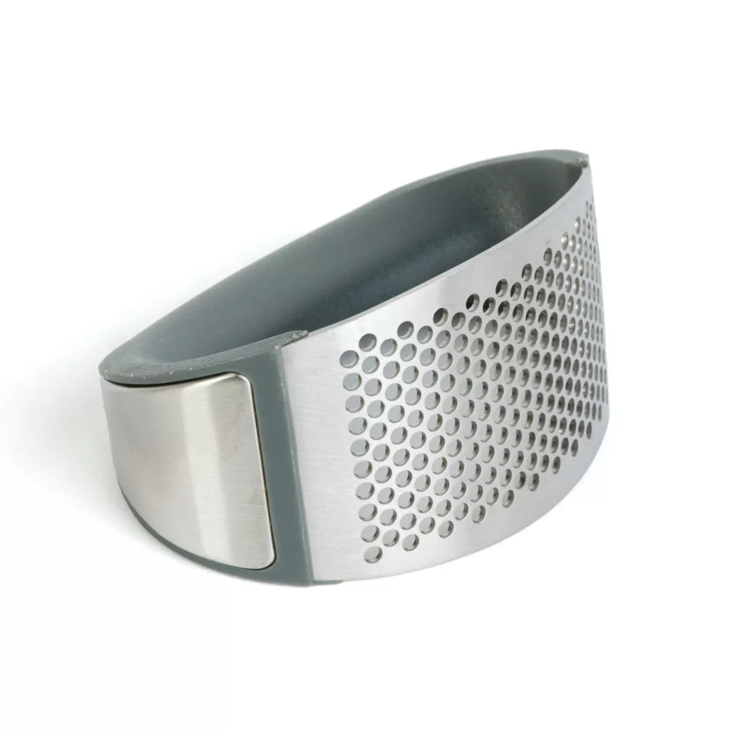 A rozsdamentes acél fokhagymanyomó modern, ívelt kialakításának köszönhetően rendkívül kényelmes és hatékony konyhai eszköz. Használata egyszerű: egy enyhe, hintázó mozdulattal gyorsan és erőfeszítés nélkül pépesíti a fokhagymát, így pillanatok alatt elkészítheti az ízletes ételek alapját. A rozsdamentes acél présfelület tartós és higiénikus, emellett könnyen tisztítható. Ergonomikus markolata biztos fogást ad, így hosszabb előkészítés során sem terheli a kezet.
