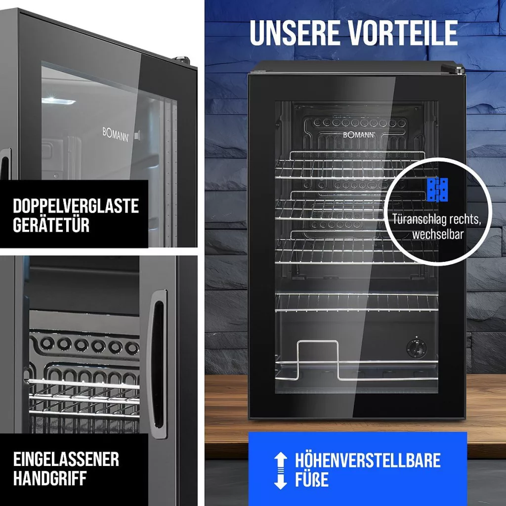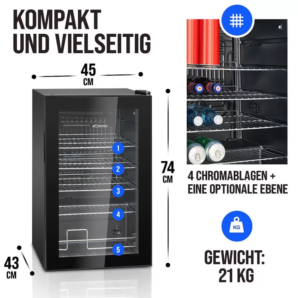 A 4 kivehető krómozott polcnak köszönhetően az italhűtő rugalmasan és áttekinthetően elhelyezhető – élvezze az optimális helykihasználás szabadságát