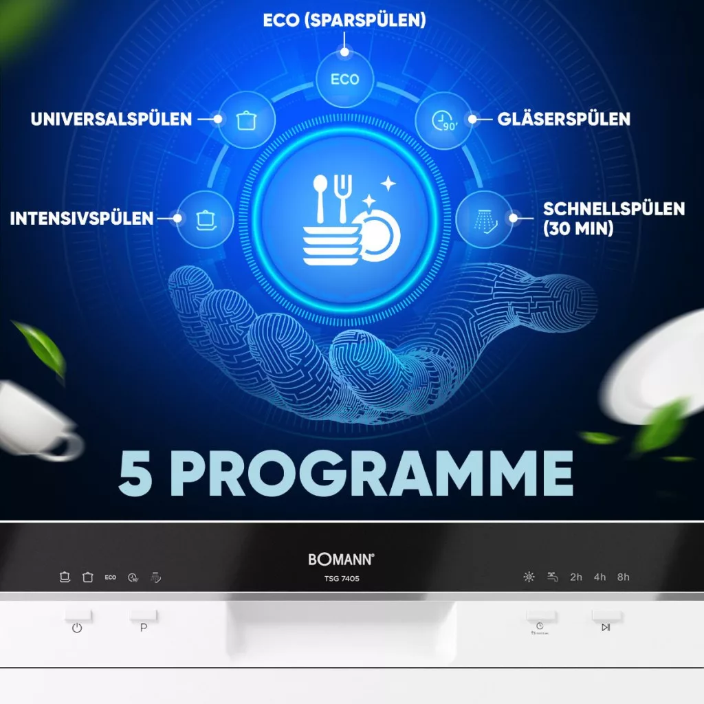 Kiváló tisztítási eredmények: a kis mosogatógép tiszta és fényes edényeket biztosít 5 programnak köszönhetően, például intenzív öblítés vagy univerzális elöntés
