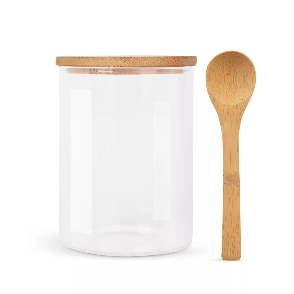 Átlátszó üveg fűszertartó, fából készült tetővel és kanállal. Bármilyen fűszer, só, cukor tárolására alkalmas. Az átlátszó tartó miatt könnyen nyomonkövetheti a fűszer mennyiségét és megtalálja azt a fűszert, amire éppen szüksége van. Igény esetén cimkézhető is.