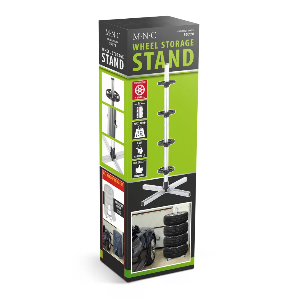 Tárolja éppen nem használt gumiabroncsait szabályosan és óvja meg őket a deformálódástól. Ennek az állványnak a segítségével a téli vagy a nyári kerekeket kis helyen tárolhatja. Az oszlopon lévő tartók biztosítószeggel rögzíthetőek, így véletlenül sem érhetnek egymáshoz a kerekek, ezáltal megakadályozható a legalsó gumi deformálódása. Az állvány könnyen és gyorsan összeszerelhető és szétszedhető ha nincsen rá szüksége.