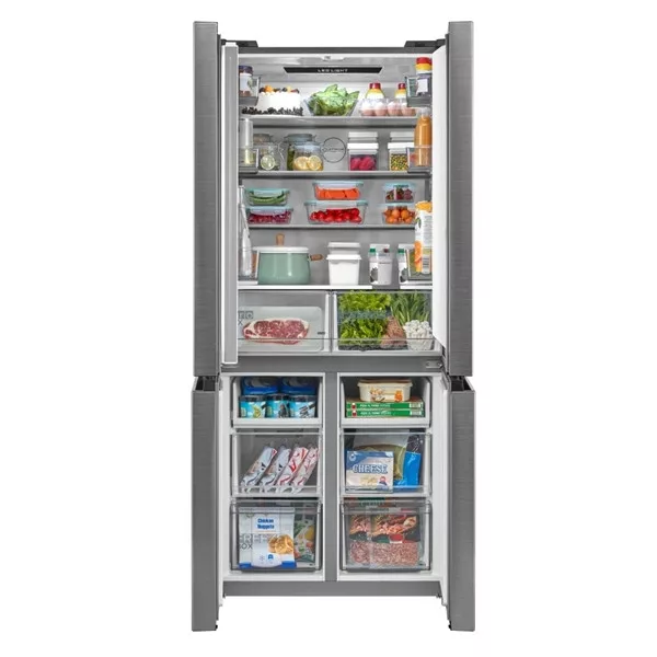 Négyajtós, Kompresszor: Inverter, Energiaosztály: E, Teljes nettó űrtartalom (L): 515, Hűtőtér nettó űrtartalma (L): 345, Fagyasztótér nettó űrtartalma (L): 170, Nettó tömeg (kg): 94, Bruttó tömeg (kg): 103, Termék méretei (mm) (Sz×Mé×Ma): 833*653*1898, Csomagolási méretek (mm) (Sz×Mé×Ma): 896*708*1965, Ajtó színe: Inox, Ajtók száma: 4, Vezérlés: Kívül - LED, Vízadagoló: Nincs, Hűtőtér belső világítása: LED, Hűtés típusa: Plastic cooling, Zöldségtároló fiók: 2 - páratartalom szabályzóval, Vario Box (0 °C-os zóna): Van, Polcok: 3, Ajtórekesz: 6, Tojástartó: Van, Fagyasztótér belső világítása: Nincs, Fagyasztófiókok: 4 fiók - 2 felnyitható tálca, Jégkészítő: Van, Hűtőrendszer: Egykörös, Multi Air Flow: Van, Sterilizálás: Van, Gyorshűtés a hűtőtérben: Van, Gyorsfagyasztás a fagyasztóban: Van, Gyerekzár: Van