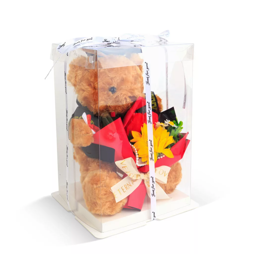 Lepje meg szerettét egy különleges ajándékkal! Ezzel a díszdobozos macival felejthetetlen lesz az ünnep, legyen szó ballagásról, évfordulóról, eljegyzésről, karácsonyról vagy akár születésnapról, névnapról. A csomag tartalmaz egy aranyos plüss mackót és egy szál virágot. A virág, elegáns papírba van csomagolva. A kompozíció egy plexi dobozban kerül szállításra, amely megvédi a mackót a portól és szennyeződésektől, így sokáig gyönyörködhet benne. Ez a bájos ajándék tökéletes lehet érettségi, ballagás, diplomaosztó vagy egyéb gratulációk alkalmával. A meglepetés garantált!