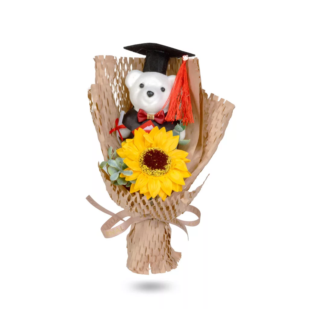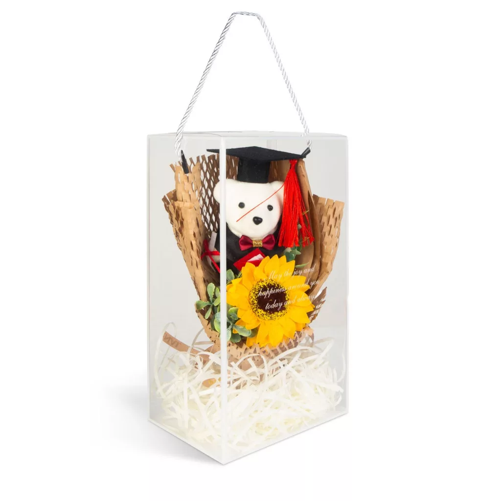 Különleges és azonnal ajándékozható dekoráció, amely tökéletes választás ballagásra, diplomaosztóra vagy bármilyen ünnepi alkalomra. Az átlátszó díszdobozban elhelyezett kompozíció egy kedves „diplomás” macit, egy élethű napraforgót és ízléses díszítőelemeket tartalmaz, így nem igényel külön csomagolást. A harmonikusan összeállított részletek és a figyelmes kidolgozás igazán mutatós ajándékká teszik.