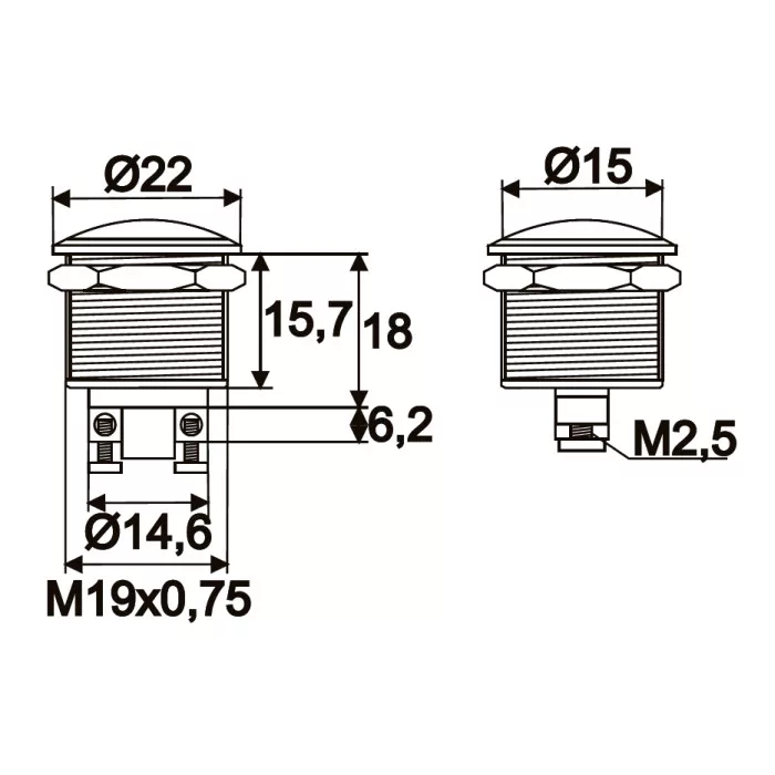 Beépíthető, süllyesztett fém kapcsoló. Széles körben elterjedt, előnye, hogy nagyon kis mértékben emelkedik ki a kezelőpanel síkjából. Tartós, jó minőségű kivitel, kör alakú fém nyomógombbal. A nyomógomb alapállapotban nyitott, a gomb megnyomásakor zárja az áramkört.