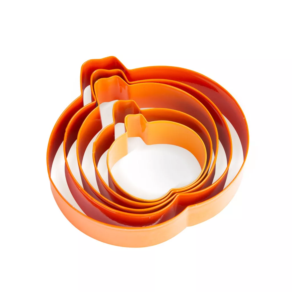 Az őszi sütik elkészítéséhez Önnek is szüksége lehet erre a különleges tök formájú süteménykiszúró szettre! A szett öt különböző méretű kiszúróformát tartalmaz, így többféle méretben elkészítheti kedvenc sütijét. A kiszúrók mindegyike erős és tartós fém anyagból készült, amely könnyen vágja át a tésztát. A különleges tök formájú kiszúróval készült sütemények a halloweeni parti fénypontjai lehetnek. A formák egymásba pakolhatóak, így kis helyen elférnek, nem foglalnak sok helyet a fiókban.
