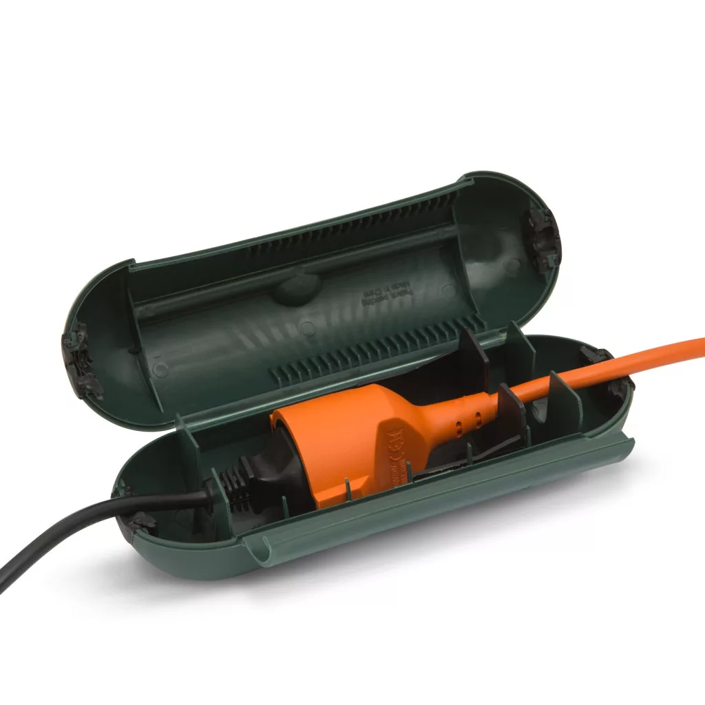 Kerti munkák során gyakran van szükségünk elektoromos szerszámokra, gépekre, melyekhez rendszerint hosszabbítókat használunk. Ezek csatlakozásának megóvására szolgál ez a védőtok, legyen szó nedvességről vagy szennyeződésről. A védőtok használata javasolt kisgyermekes családoknak is, hiszen megakadályozza, hogy a gyermek hozzáférjen az elektromos hálózat csatlakozóihoz.
